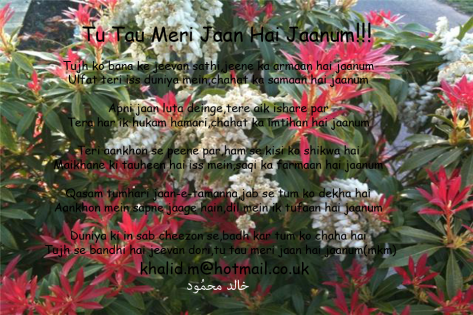 Khalid Tujh ko bana ke jeevan sathi,jeene ka armaan hai jaanum Ulfat teri iss duniya mein, chahat ka samaan hai jaanum Apni jaan luta deinge, tere har aik ishare par Tera har ik hukam hamari, chahat ka imtihan hai jaanum Teri aankhon se peene par, ham se kisi ko shikwa